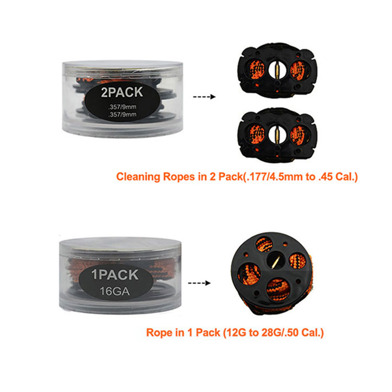● বন্দুক পরিষ্কারের দড়িগুলি শক্তভাবে সেলাই করা হয়, সহজে ভাঙা হবে না; কৃত্রিম ফাইবার দড়ি দিয়ে তৈরি বুরুশ দ্রুত এবং কার্যকরী বোর পরিষ্কার করতে পারে। ক্যালিবার সংখ্যা প্রতিটি শেষ বাদামের উপর লেজার প্রিন্ট করা হয়। দড়ি পুনঃব্যবহারের জন্য ধোয়া যায়।