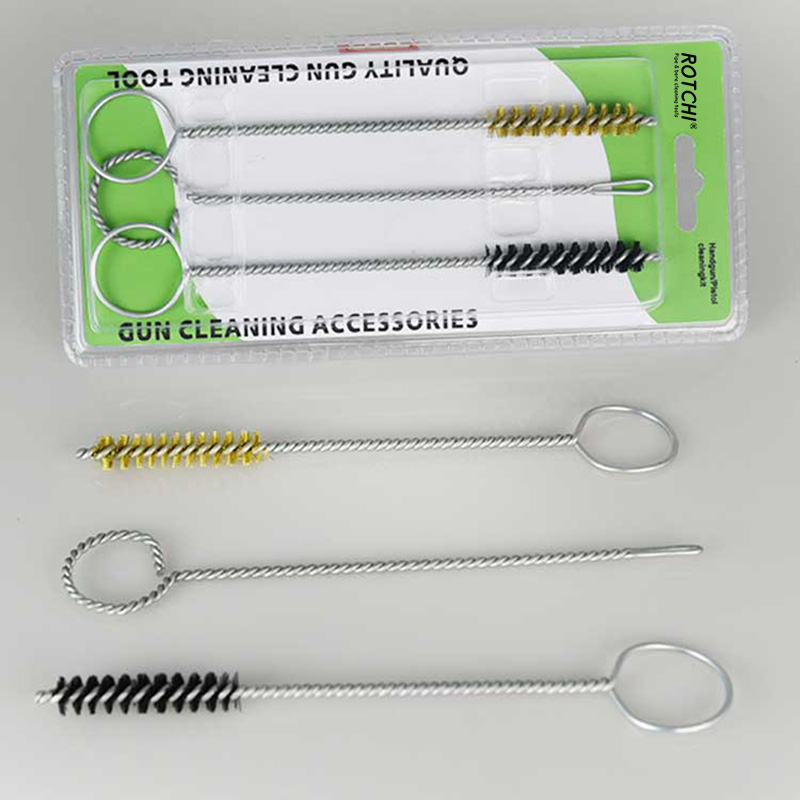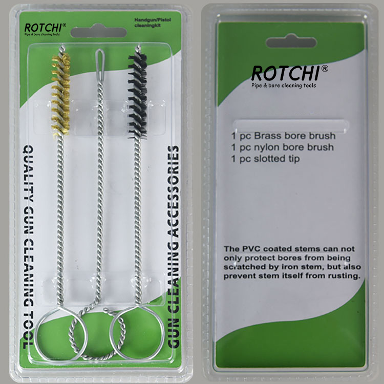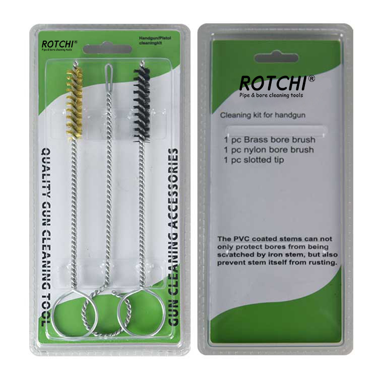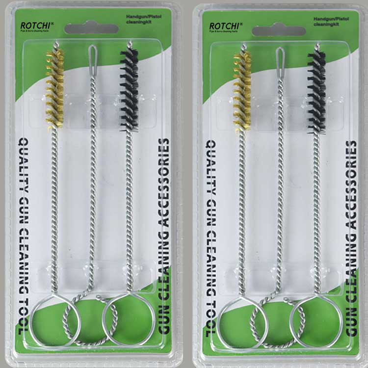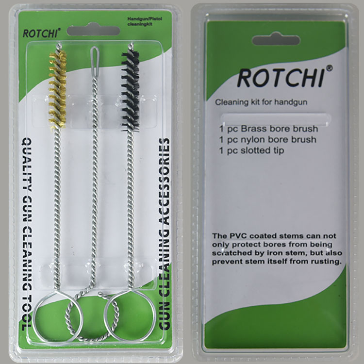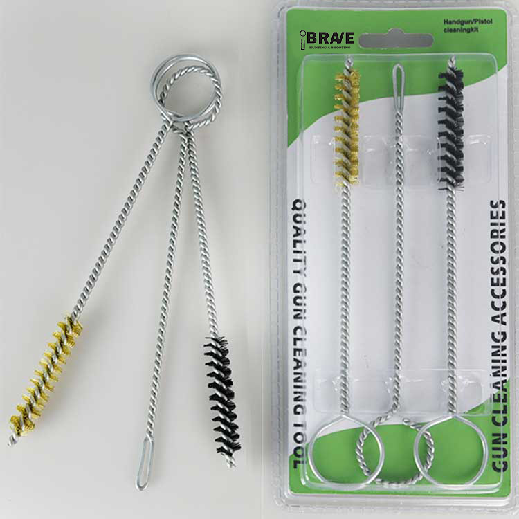 3 পিসি সেটহ্যান্ডগান ক্লিয়ারিং কিট, ডবল ফোস্কায় প্যাক করা। একটি ব্রাস বোর ক্লিনিং ব্রাশ, একটি নাইলন বোর ক্লিনিং ব্রাশ এবং একটি স্লটেড প্যাচ হোল্ডার। সহজ এবং কার্যকর.