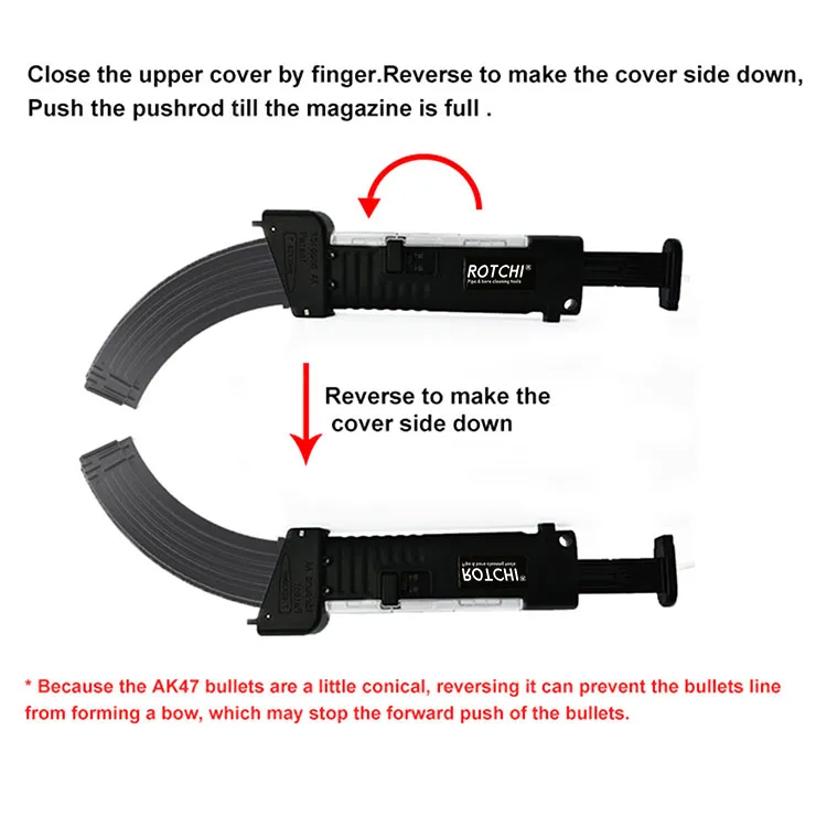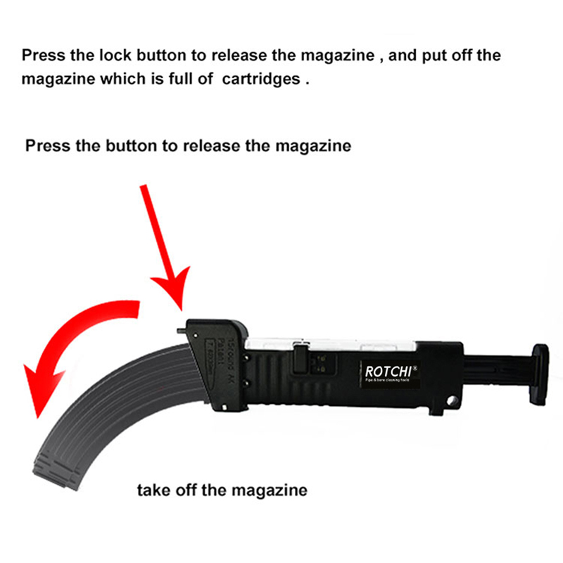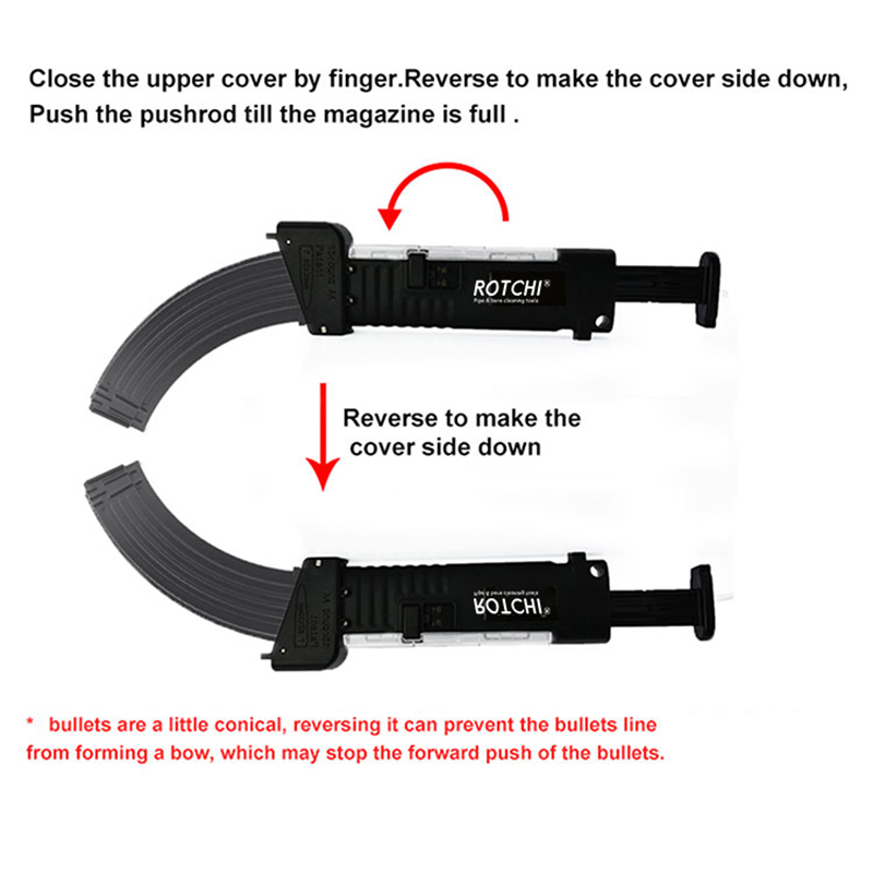 ● খাঁজে পূর্ণ কার্তুজগুলি পূরণ করুন, AK যান্ত্রিক নীতির মতো ম্যাগাজিনটি ইনস্টল করুন। pusher ধাক্কা, কার্তুজ সহজেই ম্যাগাজিনে প্রবেশ করবে.